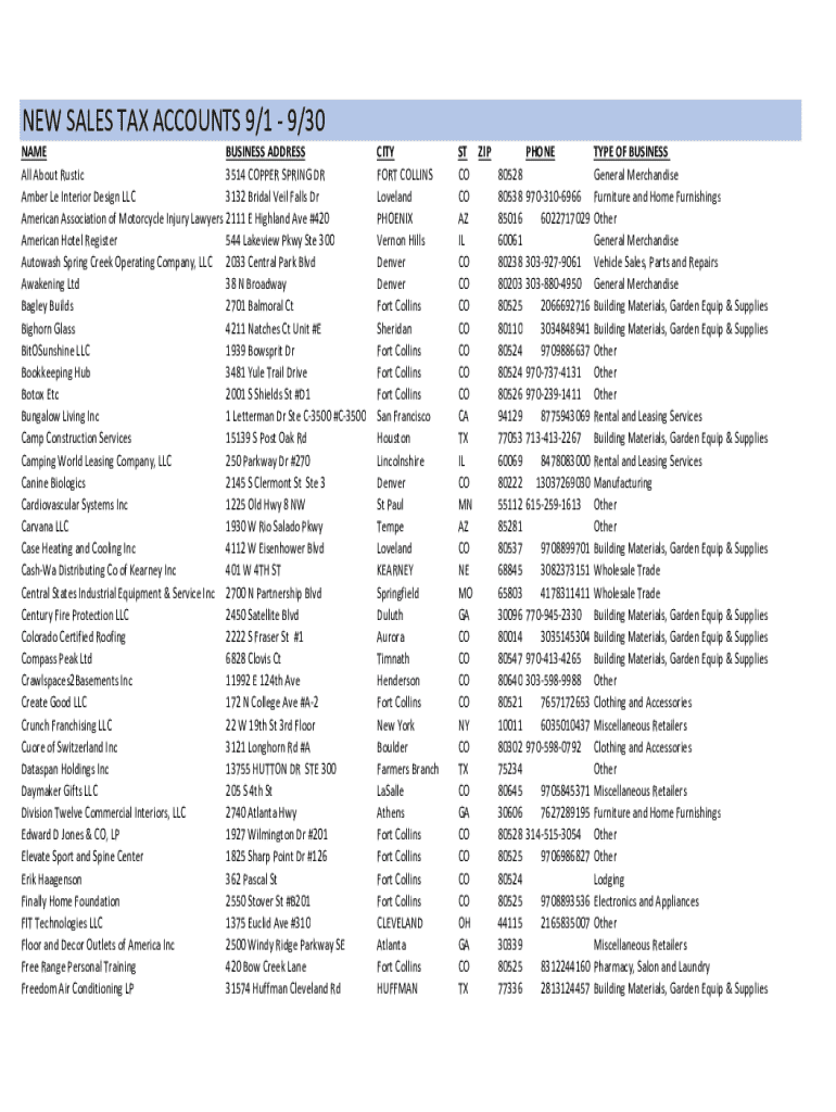 This document lists new sales tax accounts registered between September 1 and September 30, including names, addresses, types of businesses, and contact information.