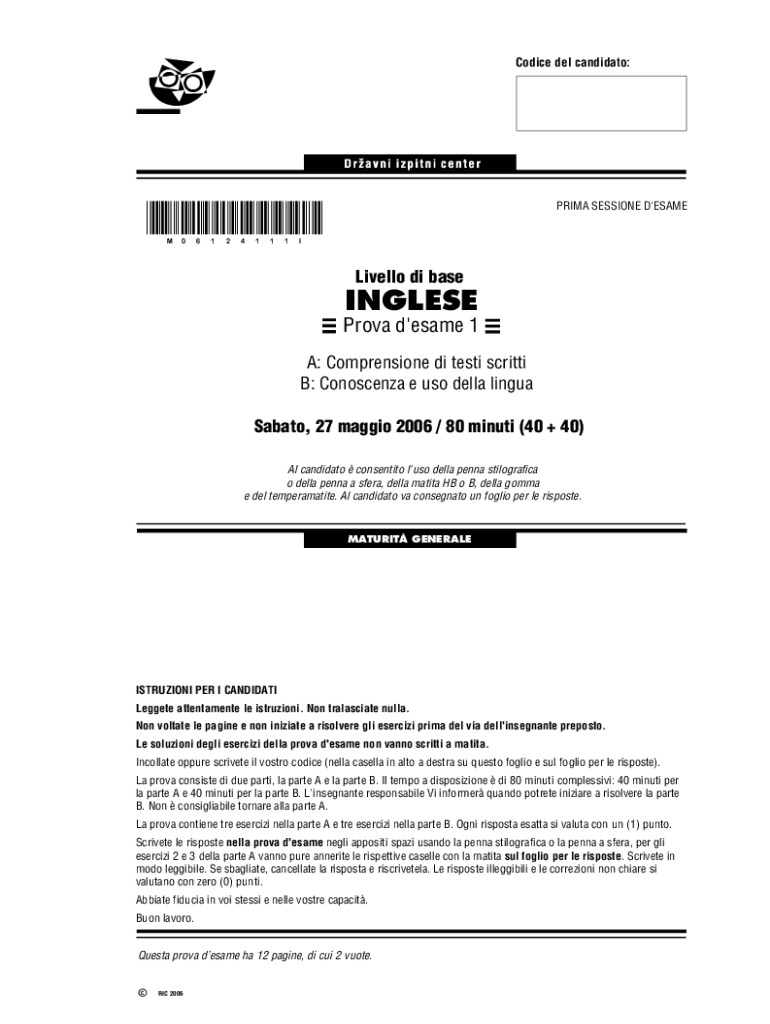 Codice del candidato:PRIMA SESSIONE D\'ESAME*M06124111I* Livello di baseINGLESE Prova d\'esame 1 A: Comprensione di testi scritti B: Conoscenza e uso della lingua Sabato, 27 maggio 2006 / 80 minuti
