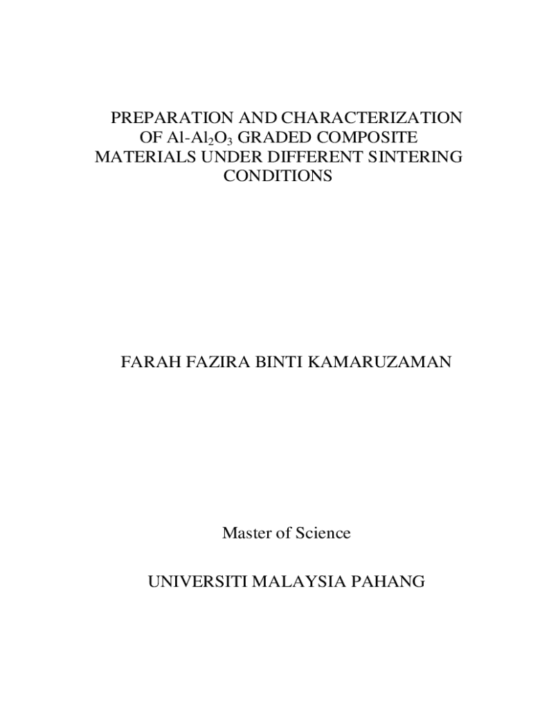 PREPARATION AND CHARACTERIZATION OF AlAl2O3 GRADED COMPOSITE MATERIALS UNDER DIFFERENT SINTERING CONDITIONSFARAH FAZIRA BINTI KAMARUZAMANMaster of Science UNIVERSITI MALAYSIA PAHANGSUPERVISORS DECLARATION