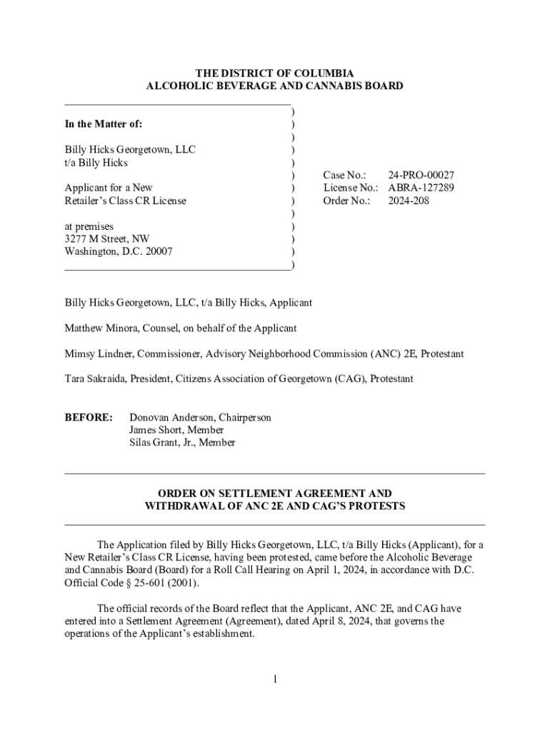 THE DISTRICT OF COLUMBIA ALCOHOLIC BEVERAGE AND CANNABIS BOARD ___ ) In the Matter of: ) ) Billy Hicks Georgetown, LLC ) t/a Billy Hicks ) ) Case No.: 24PRO00027 Applicant for a New ) License No.:
