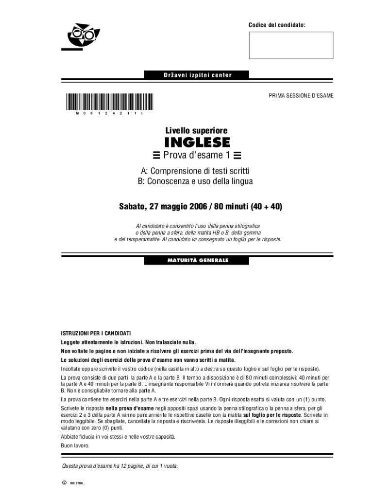 Codice del candidato:PRIMA SESSIONE D\'ESAME*M06124211I* Livello superioreINGLESE Prova d\'esame 1 A: Comprensione di testi scritti B: Conoscenza e uso della lingua Sabato, 27 maggio 2006 / 80 minuti