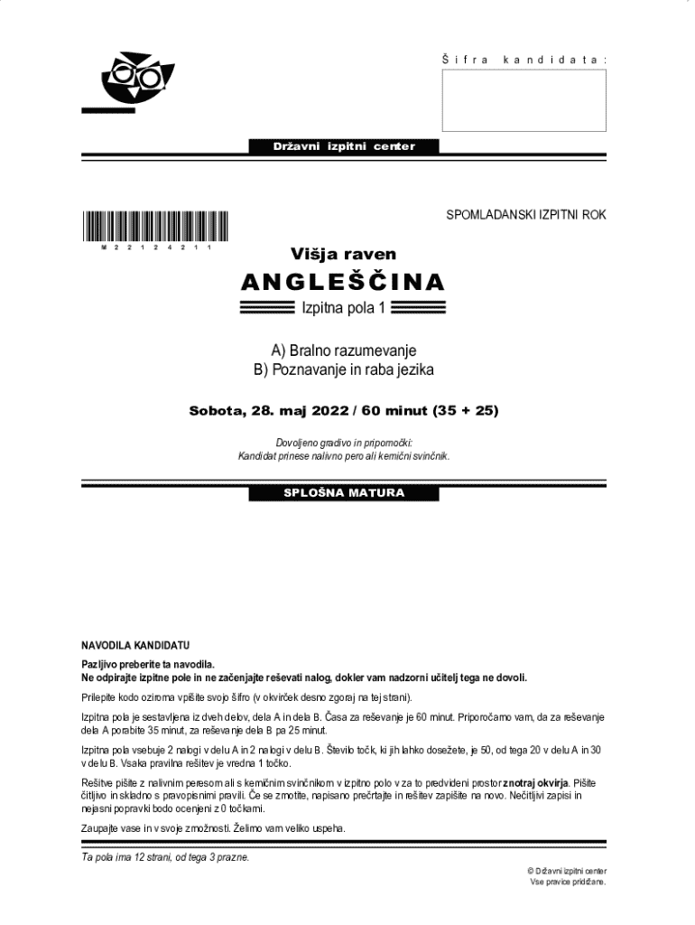 i f r ak a n d i d a t a :Dravni izpitni centerSPOMLADANSKI IZPITNI ROK*M22124211*Vija ravenANGLEINA Izpitna pola 1A) Bralno razumevanje B) Poznavanje in raba jezika Sobota, 28. maj 2022 / 60 minut