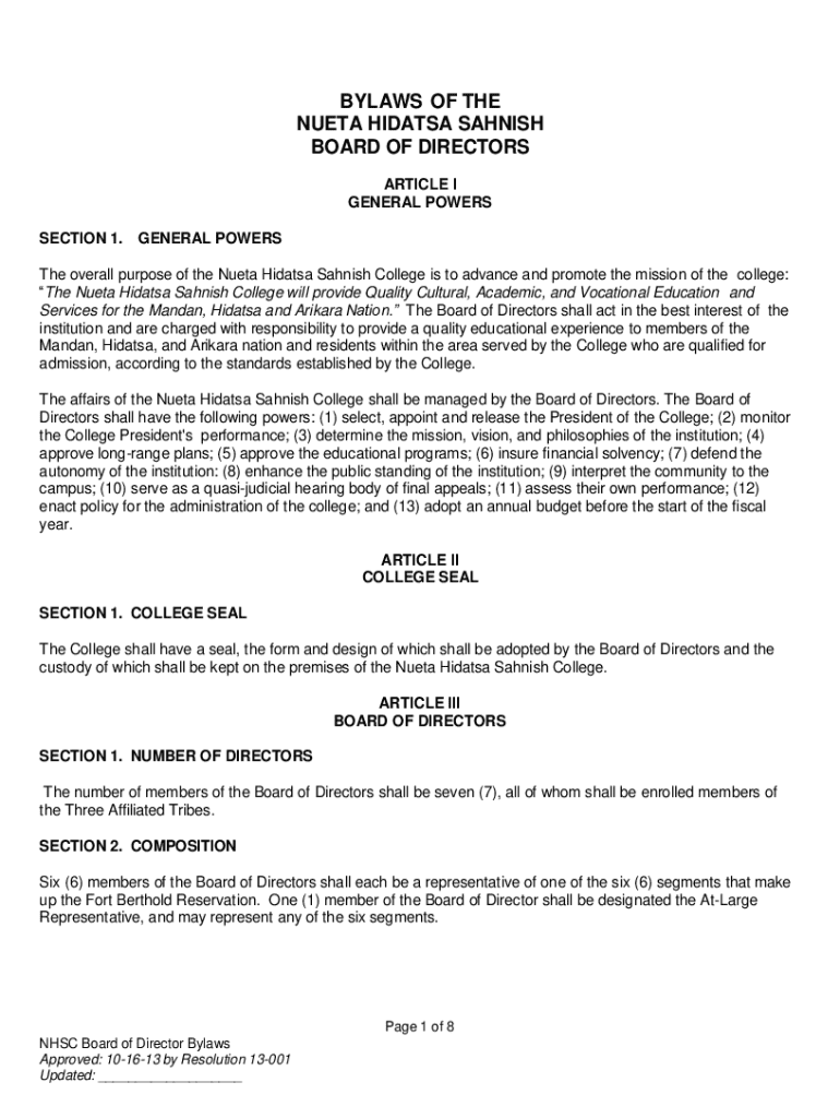 These bylaws outline the governance structure, powers, appointments, and responsibilities of the Board of Directors for the Nueta Hidatsa Sahnish College.
