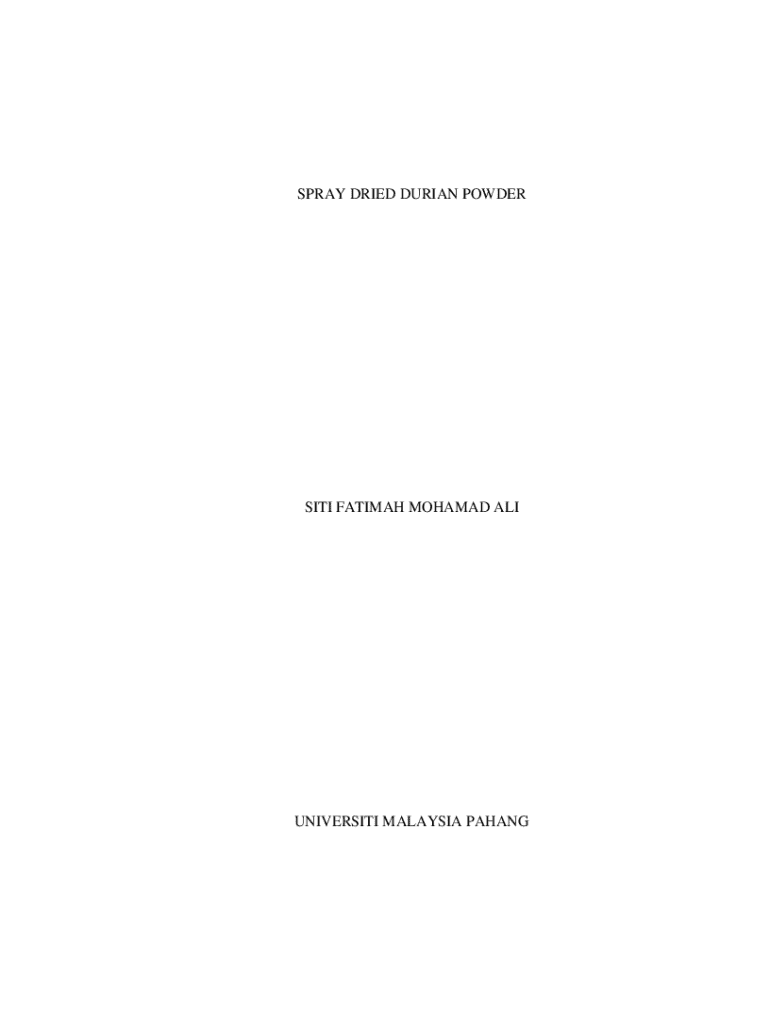 Dokumen ini mengandungi pengesahan status tesis oleh Siti Fatimah Mohamad Ali berkaitan dengan tesis yang bertajuk \'Spray Dried Durian Powder\'. Tesis ini diserahkan kepada Fakulti Kejuruteraan Kimia