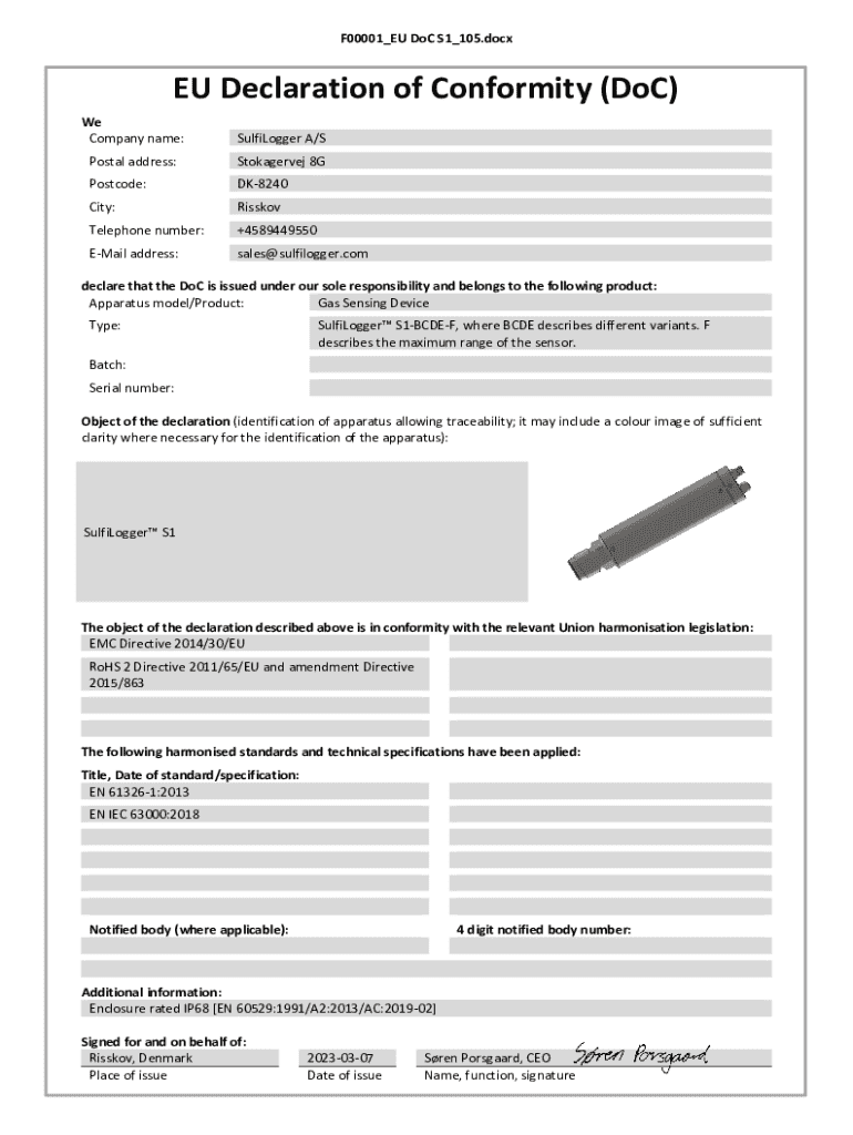 This document serves as a declaration from SulfiLogger A/S confirming that the Gas Sensing Device SulfiLogger™ S1 is in conformity with relevant Union harmonisation legislation including EMC Directive