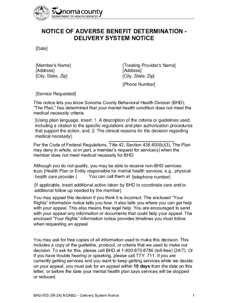 Get the free Notice of Adverse Benefit Determination Delivery System Notice