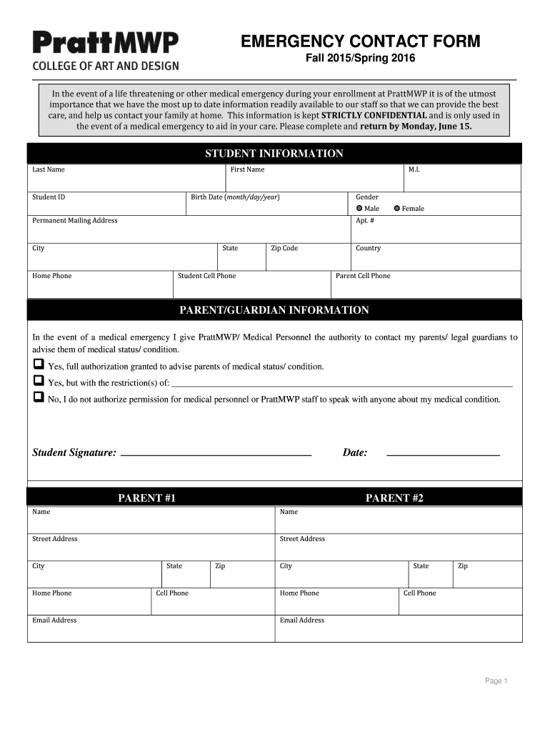 EMERGENCY CONTACT FORM Fall 2015/Spring 2016 In the event of a life-threatening or other medical emergency during your enrollment at Pratt it is of the utmost importance that we have the most up to