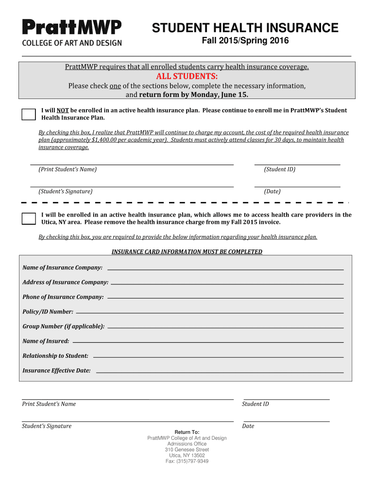 STUDENT HEALTH INSURANCE Fall 2015/Spring 2016 Pratt requires that all enrolled students carry health insurance coverage. ALL STUDENTS: Please check one of the sections below, complete the necessary