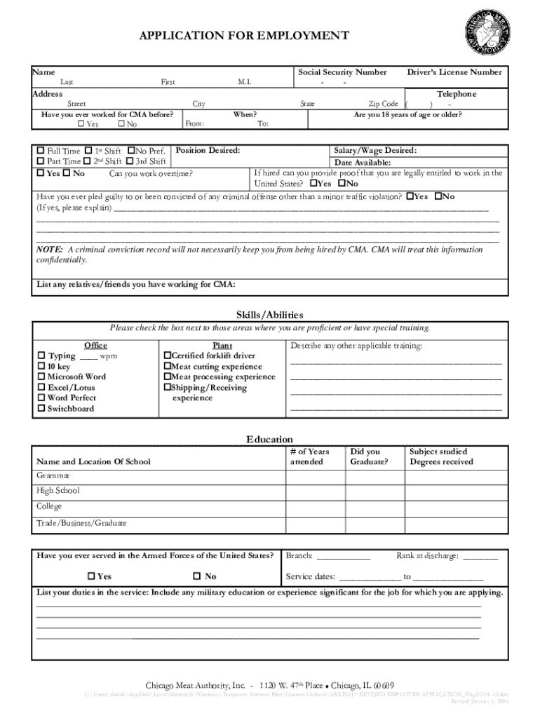 This document is an employment application form used by Chicago Meat Authority, Inc. It collects personal information, employment history, education, skills, and legal eligibility to work in the United