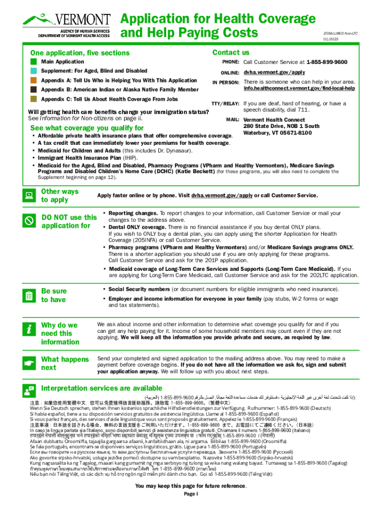 This application form helps individuals apply for health coverage and financial assistance for medical costs through Vermont Health Connect, including Medicaid and private insurance options.