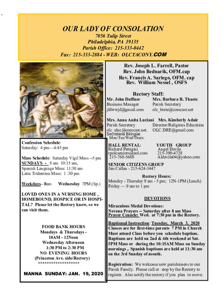 OUR LADY OF CONSOLATION 7056 Tulip Street Philadelphia, PA 19135 Parish Office: 2153330442 Fax: 2153332884 WEB: OLCTACONY.COM Rev. Joseph L. Farrell, Pastor Rev. John Bednarik, OFM.cap Rev. Francis