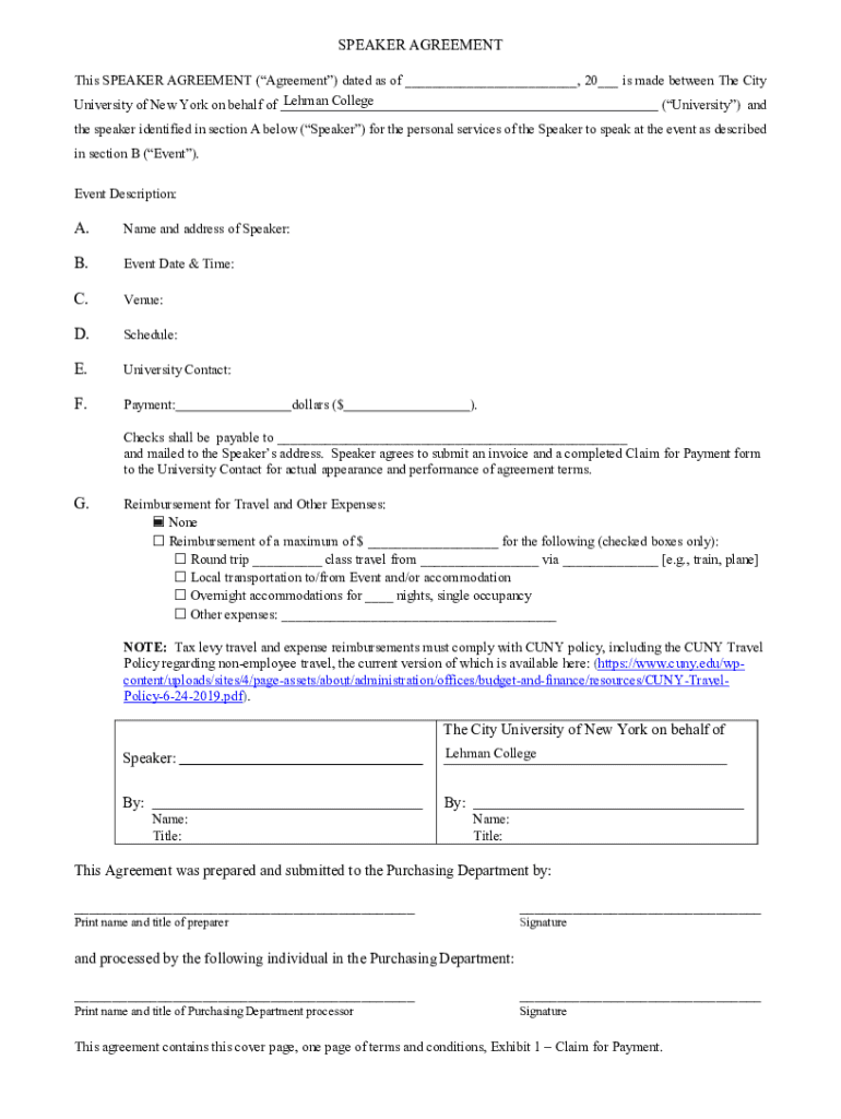 This Speaker Agreement outlines the terms and conditions under which a speaker is engaged by Lehman College to provide personal services at an event. It includes details regarding payment, reimbursement