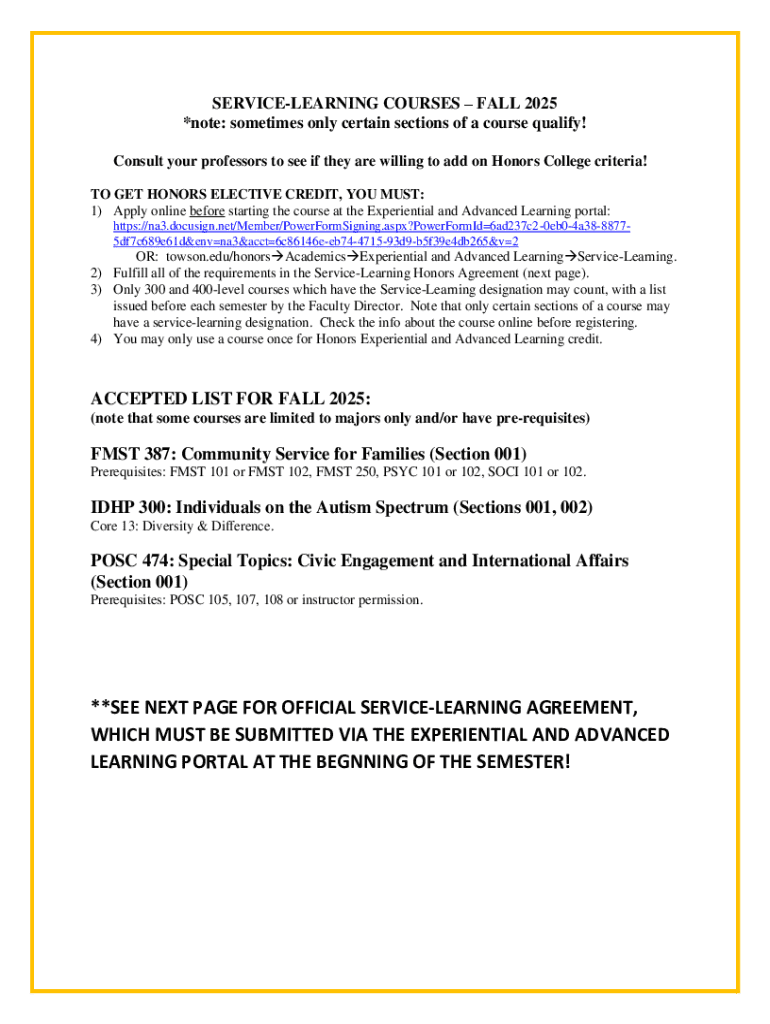 This document outlines the requirements and procedures for obtaining Honors Elective Credit through Service-Learning courses offered in Fall 2025. It includes application instructions, eligible courses,