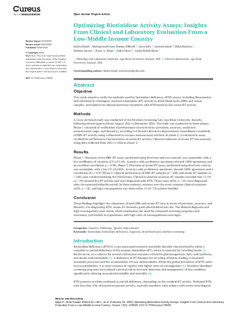 Open Access Original ArticleOptimizing Biotinidase Activity Assays: Insights From Clinical and Laboratory Evaluation From a LowMiddle Income CountryReview began 01/22/2025 Review ended 02/04/2025Hafsa