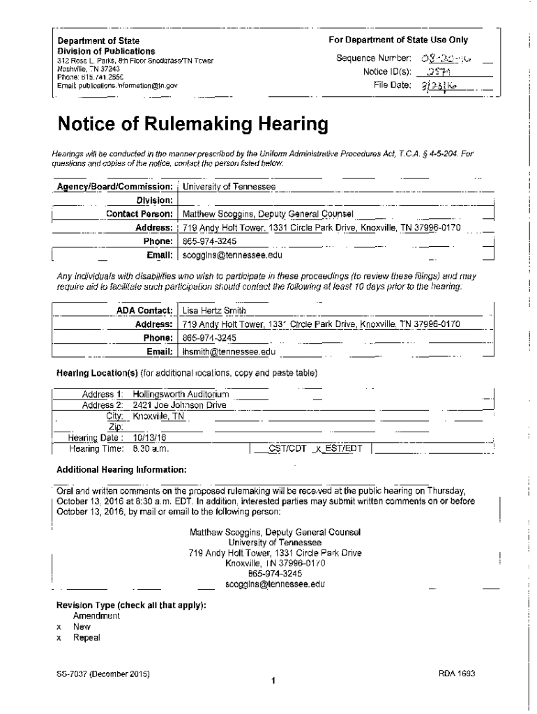 For Department of State Use OnlyDepartment of State Division of PublicationsSequence Number:312 Rosa L. Parks, 8th Floor Snodgrass/TN Tower Nashville, TN 37243 Phone: 615.741.2650 Email: publications.information@tn.govNotice