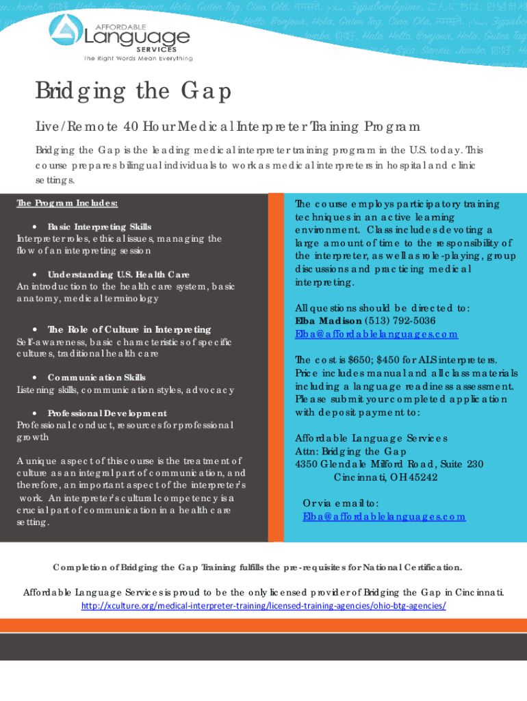 Bridging the Gap is the leading medical interpreter training program in the U.S., preparing bilingual individuals to work as medical interpreters in hospital and clinic settings. The program covers