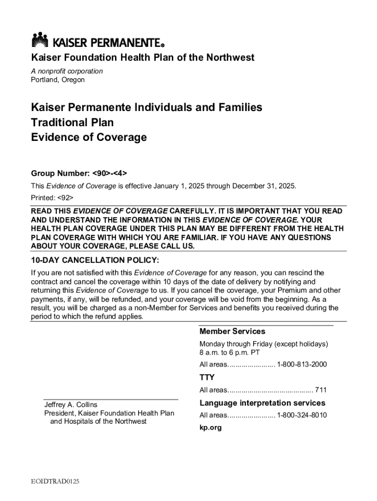 Get the free Kaiser Permanente Individuals and Families Traditional Plan Evidence of Coverage