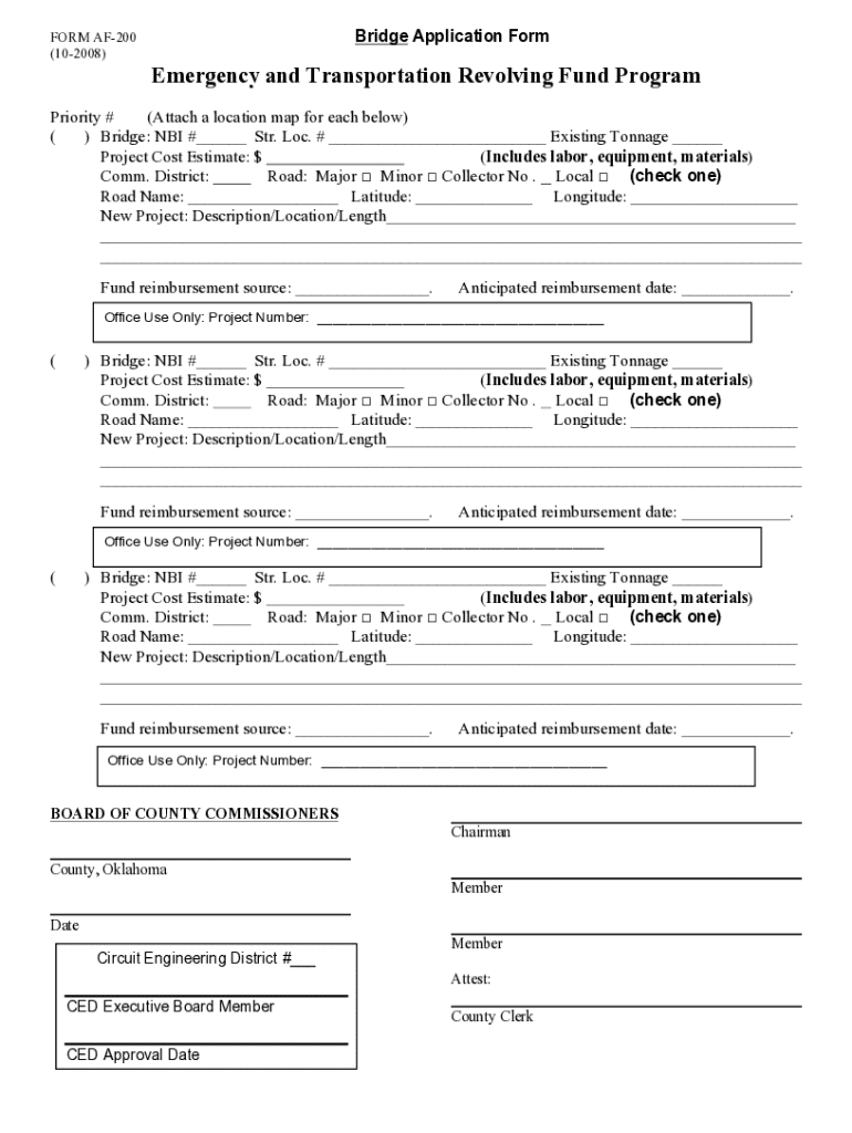 This form is used to apply for funding under the Emergency and Transportation Revolving Fund Program for bridge projects. It requires details such as location, project cost estimates, and anticipated