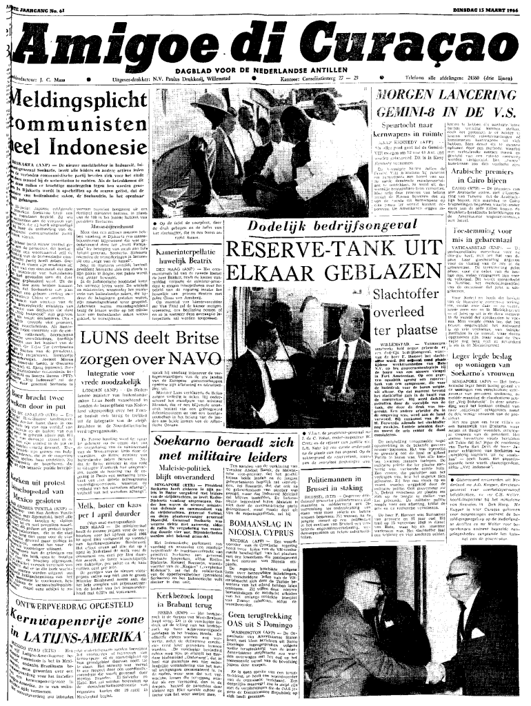 \' ,J*B JAARGANG Mo. 6lDINSDAG 15 MAART 1966di CuracaoAmigoe facteur: J.C. MaasUitgeverdrukker: N.V.\"DAGBLAD VOOR DE NEDERLANDSE ANTILLEN Paulus Drukkerij, Willemstad Kantoor: Conscientiesteeg 27