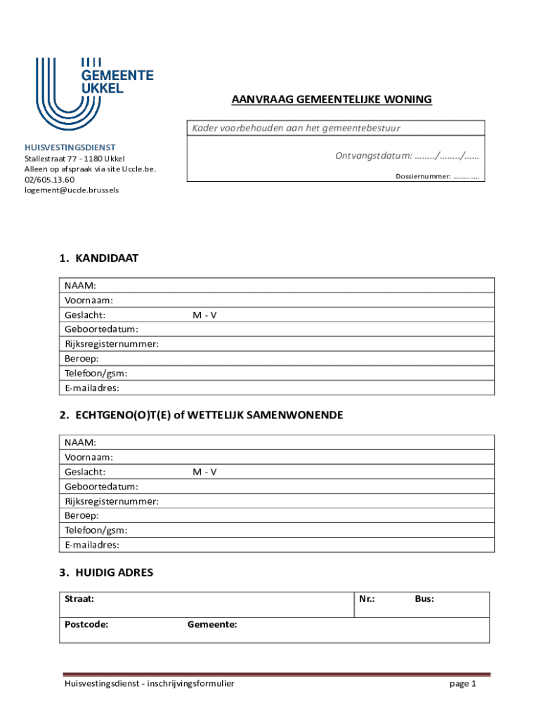 Dit formulier is bedoeld voor de aanvraag van een gemeentelijke woning. Het bevat secties voor persoonlijke gegevens van de kandidaat, diens echtgenoot of wettelijk samenwonende, en andere gezinsleden.