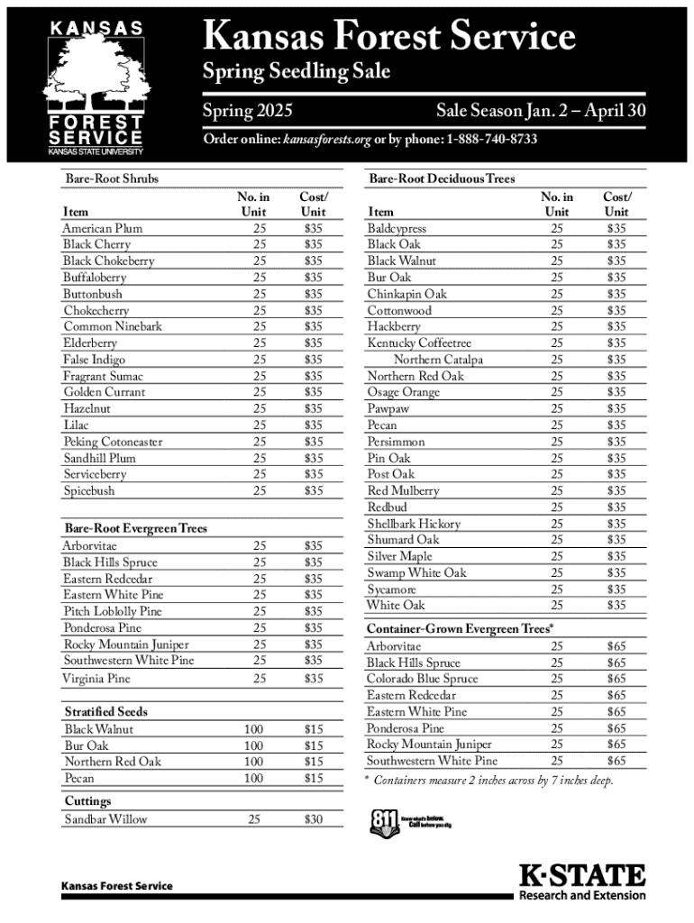 This document provides details on the Spring 2025 seedling sale by the Kansas Forest Service, including ordering information, available plant items, costs per unit, and additional non-plant items.