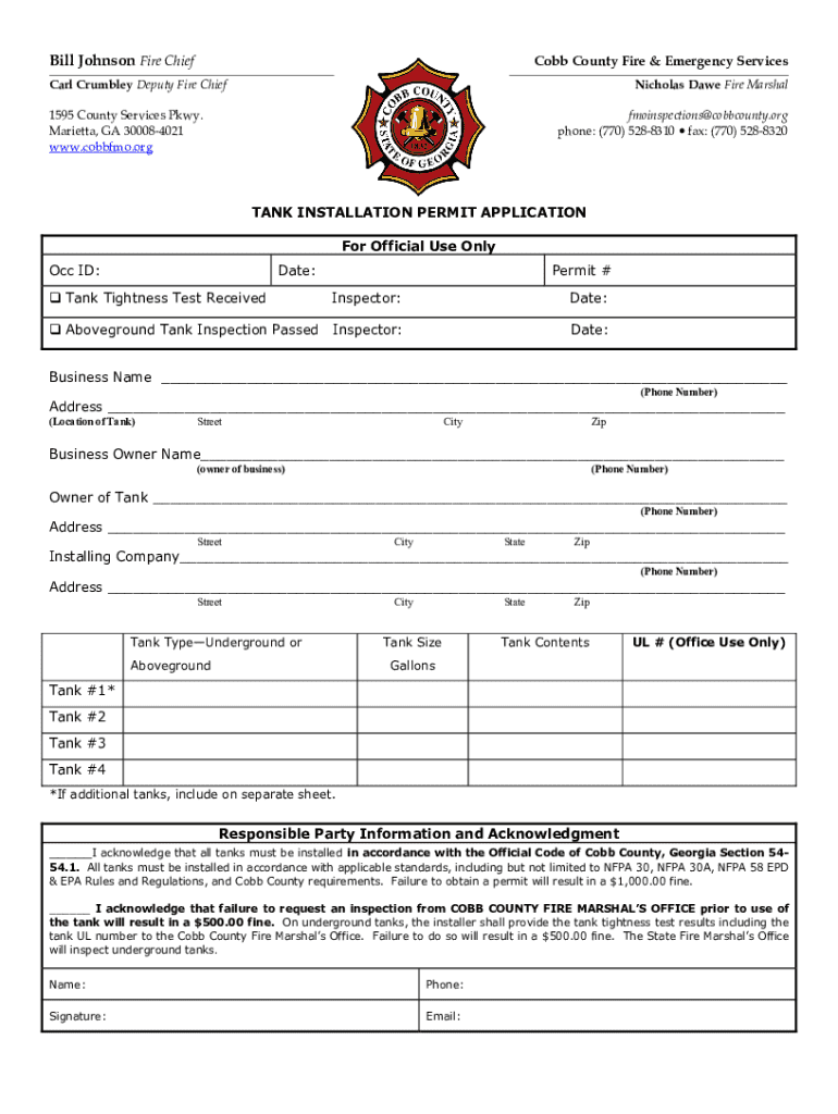 Application form required for obtaining a permit for tank installation, including necessary inspections and compliance with regulations.