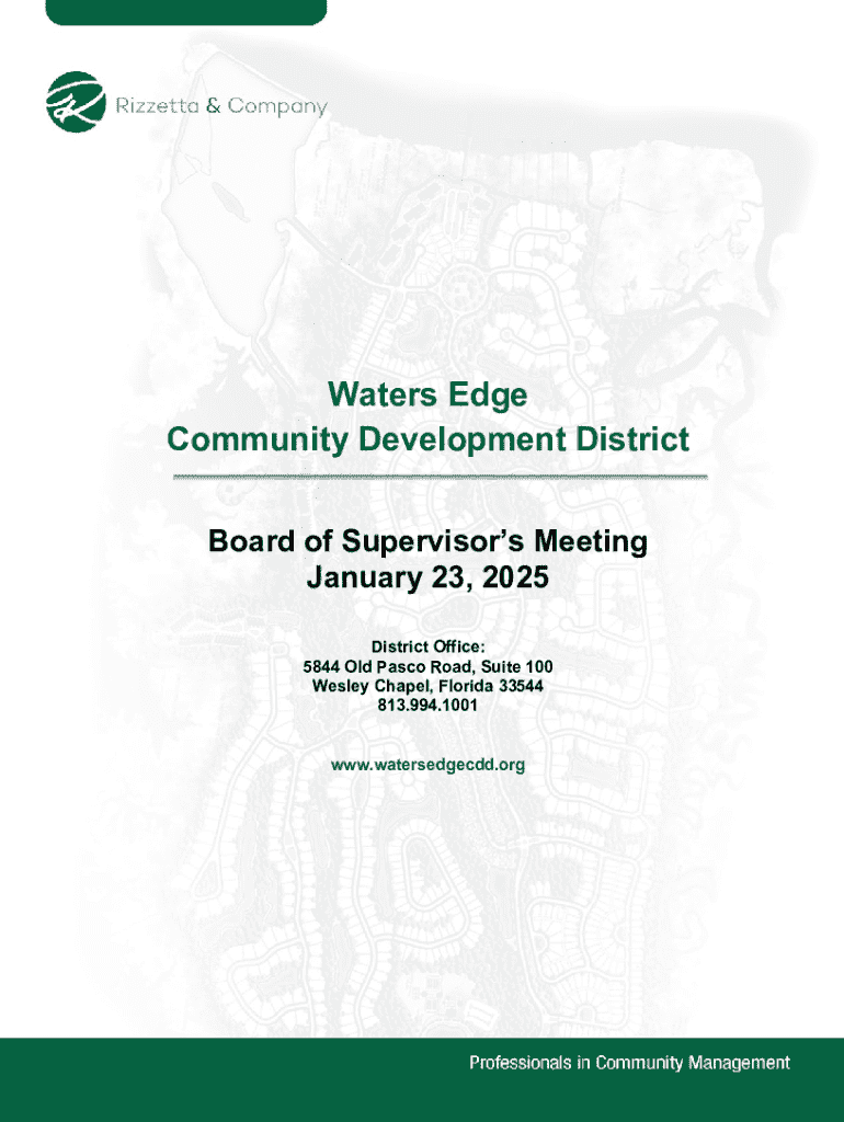Waters Edge Community Development District Board of Supervisors Meeting January 23, 2025 District Office: 5844 Old Pasco Road, Suite 100 Wesley Chapel, Florida 33544 813.994.1001 www.watersedgecdd.orgWATERS