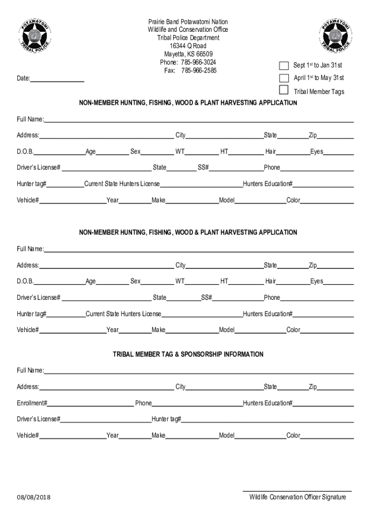This application form is for non-members to apply for hunting, fishing, wood, and plant harvesting within the Prairie Band Potawatomi Nation. It requires details such as personal identification, vehicle