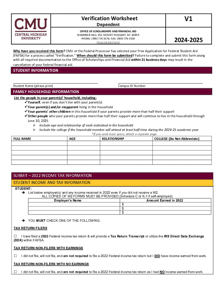 Este formulario es una Worksheet de verificación para estudiantes dependientes seleccionados para la verificación de FAFSA, que debe ser completado y enviado junto con la documentación requerida
