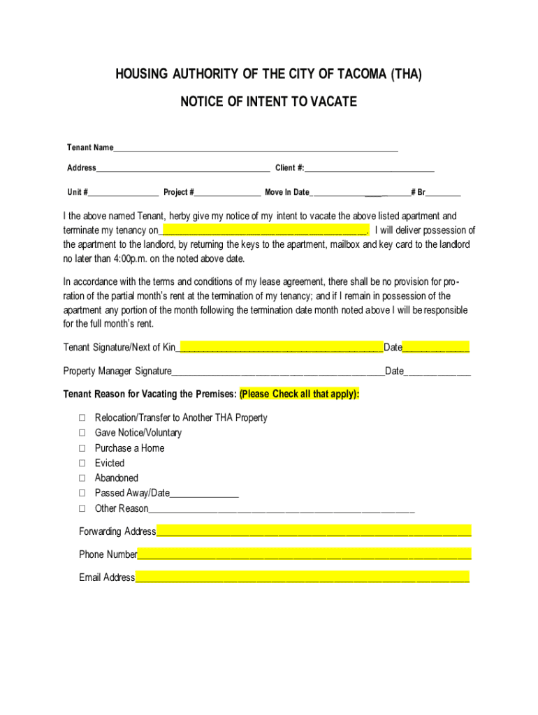 Este documento es una notificación formal del inquilino a la Autoridad de Vivienda de Tacoma, indicando su intención de desocupar el apartamento y los términos relacionados con la finalización