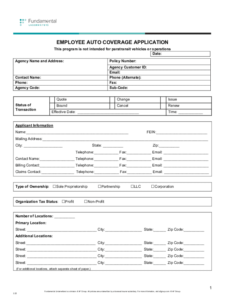 This application is for obtaining auto coverage for employees, particularly in organizations providing services such as home health care or vocational rehabilitation. It requires information regarding