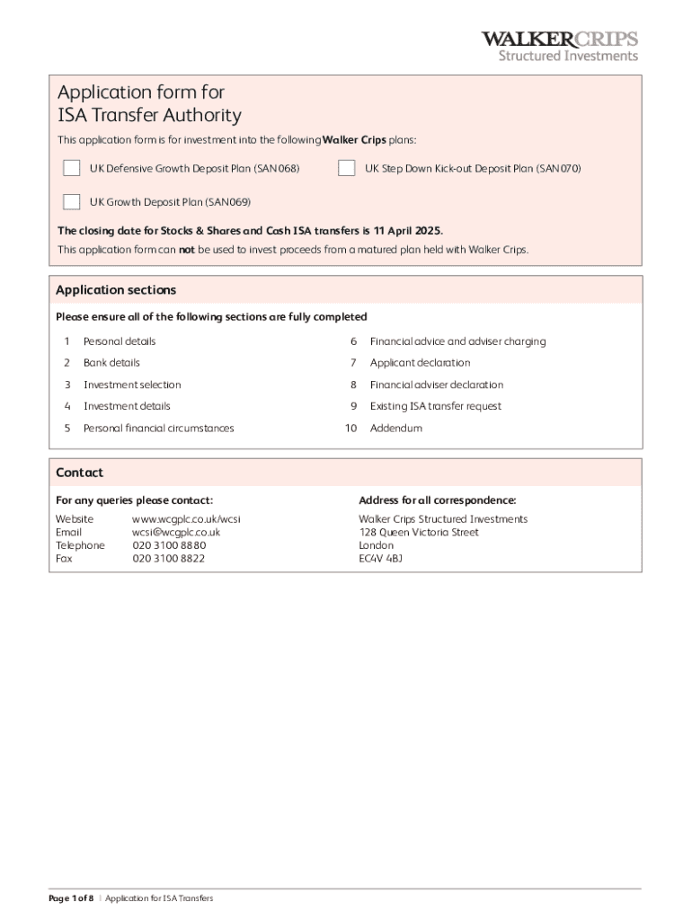 This application form is for clients wishing to transfer their ISA investments into Walker Crips plans, including Cash and Stocks & Shares ISAs. It details the necessary sections that need to be completed,