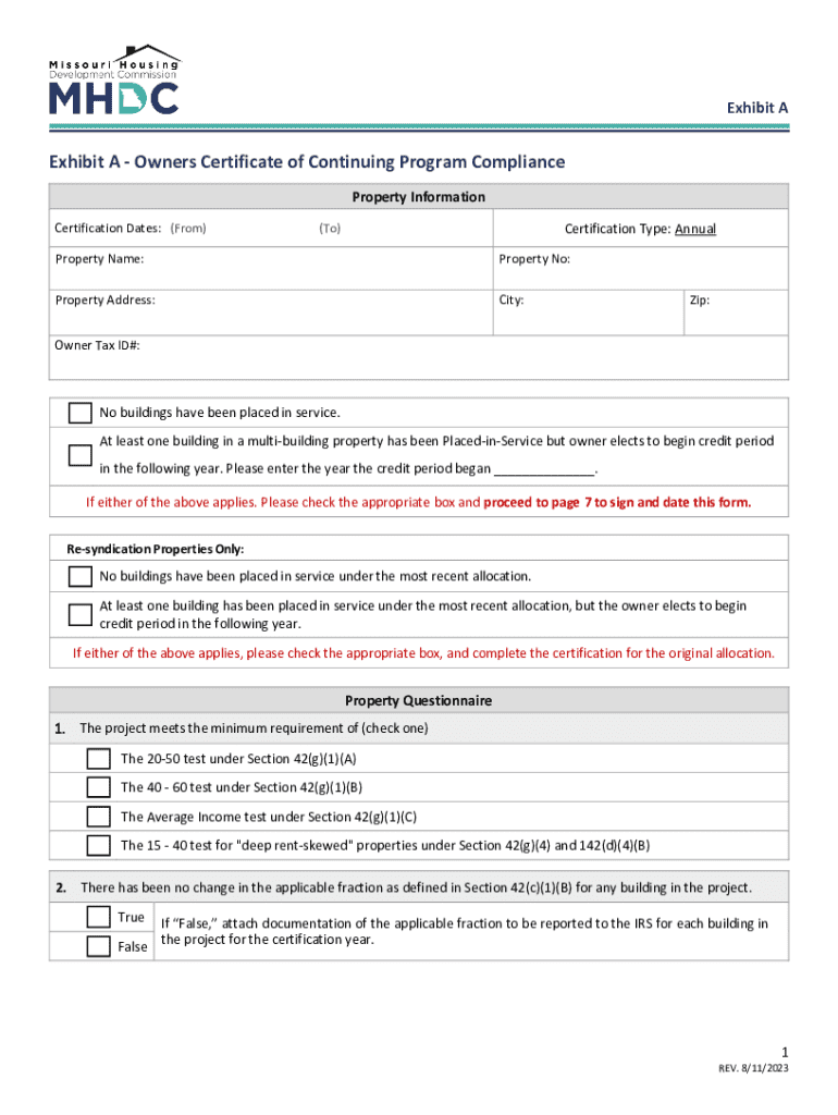 This form certifies the continuing compliance of a property with program requirements for low-income housing. It includes sections for property information, certification details, compliance checks,