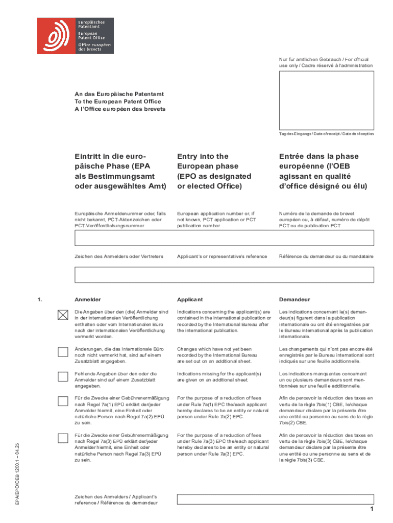 This form is used for entering the European phase of a patent application under the European Patent Convention (EPC). It includes provisions for submitting application documents, requests for examination,