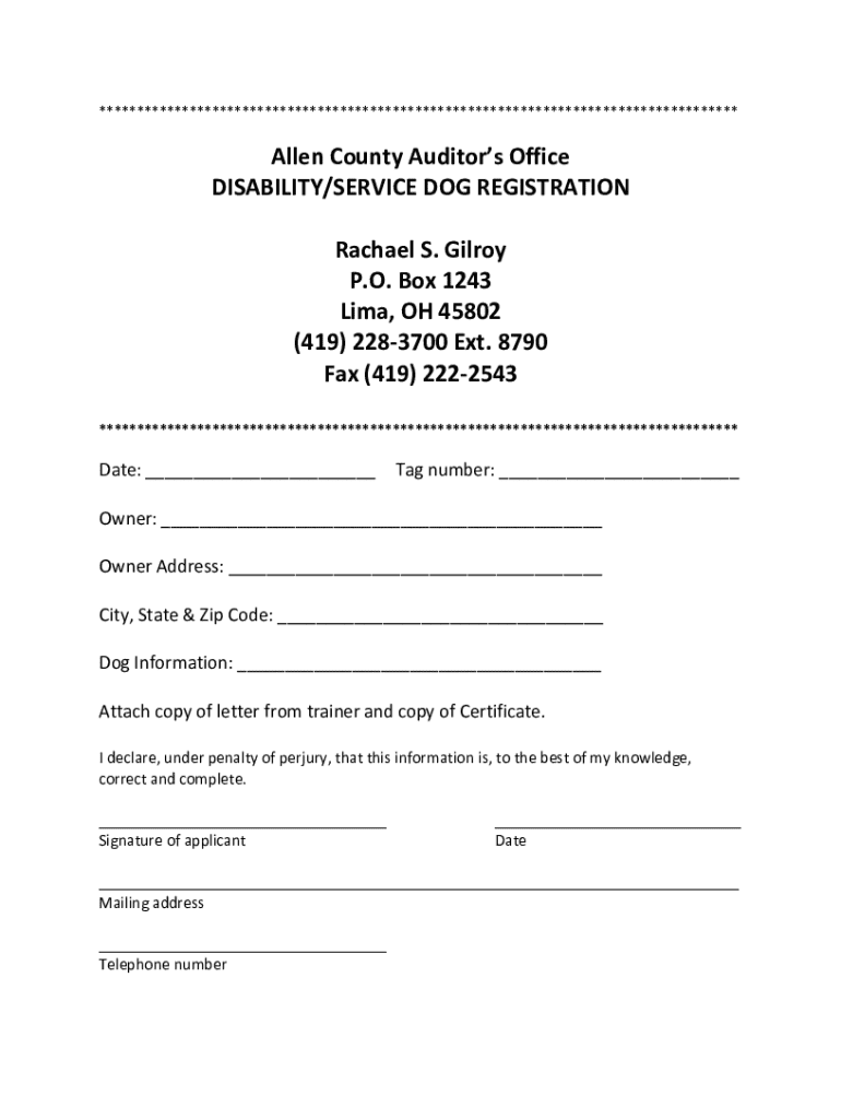 This document is used to register a disability or service dog with the Allen County Auditor’s Office. It requires the owner\'s information, dog information, and supporting documentation, including