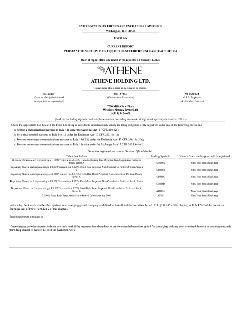 This document is a Current Report filed by Athene Holding Ltd. with the United States Securities and Exchange Commission, detailing the company\'s financial results for the fourth quarter of 2024