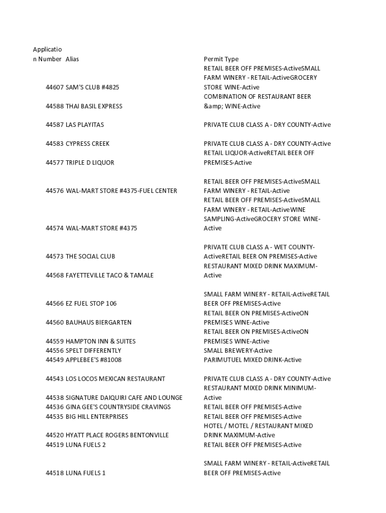 Applicatio n Number Alias44588 THAI BASIL EXPRESSPermit Type RETAIL BEER OFF PREMISESActiveSMALL FARM WINERY RETAILActiveGROCERY STORE WINEActive COMBINATION OF RESTAURANT BEER & WINEActive44587 LAS