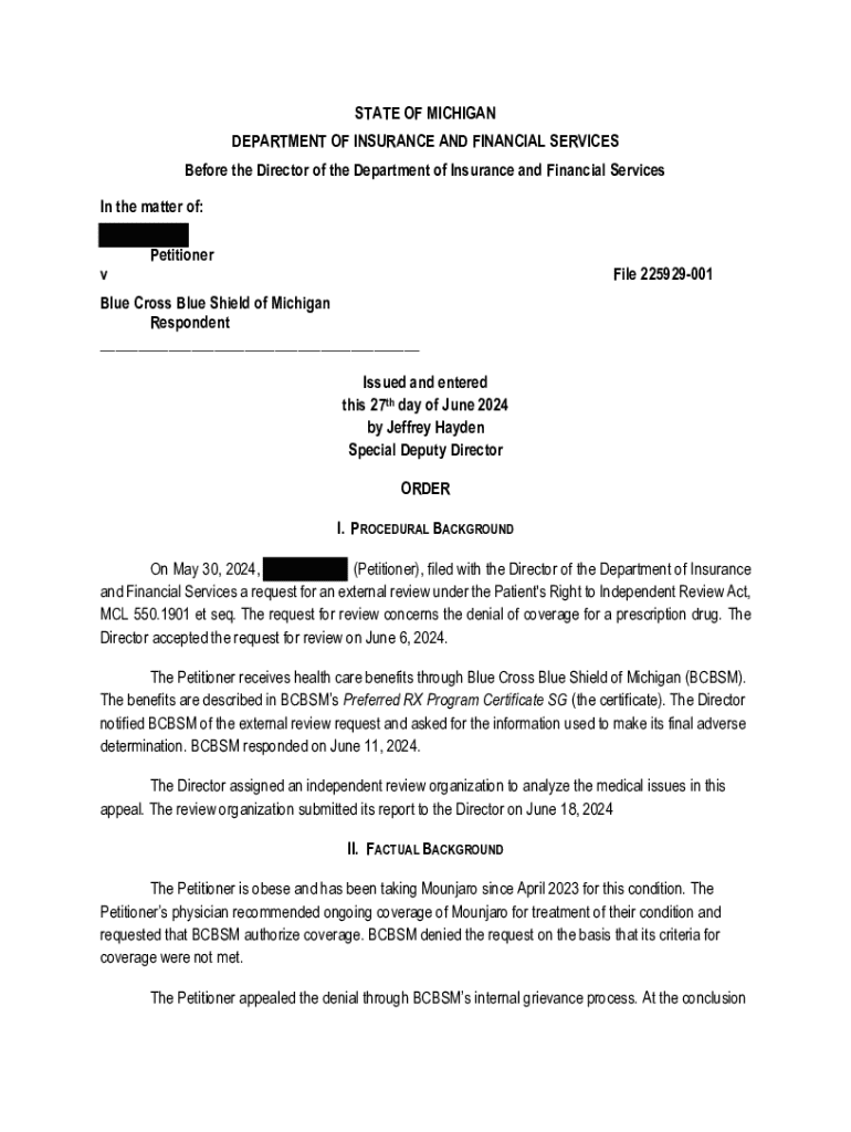 STATE OF MICHIGAN DEPARTMENT OF INSURANCE AND FINANCIAL SERVICES Before the Director of the Department of Insurance and Financial Services In the matter of:vPetitionerFile 225929001Blue Cross Blue