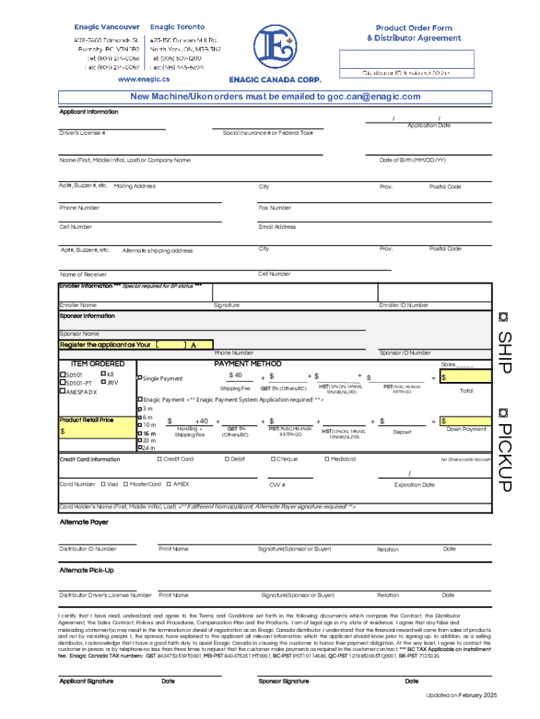 New Machine/Ukon orders must be emailed to goc.can@enagic.com Applicant Information// Application DateDriver\'s License #Social Insurance # or Federal Tax#Name (First, Middle Initial, Last) or Company