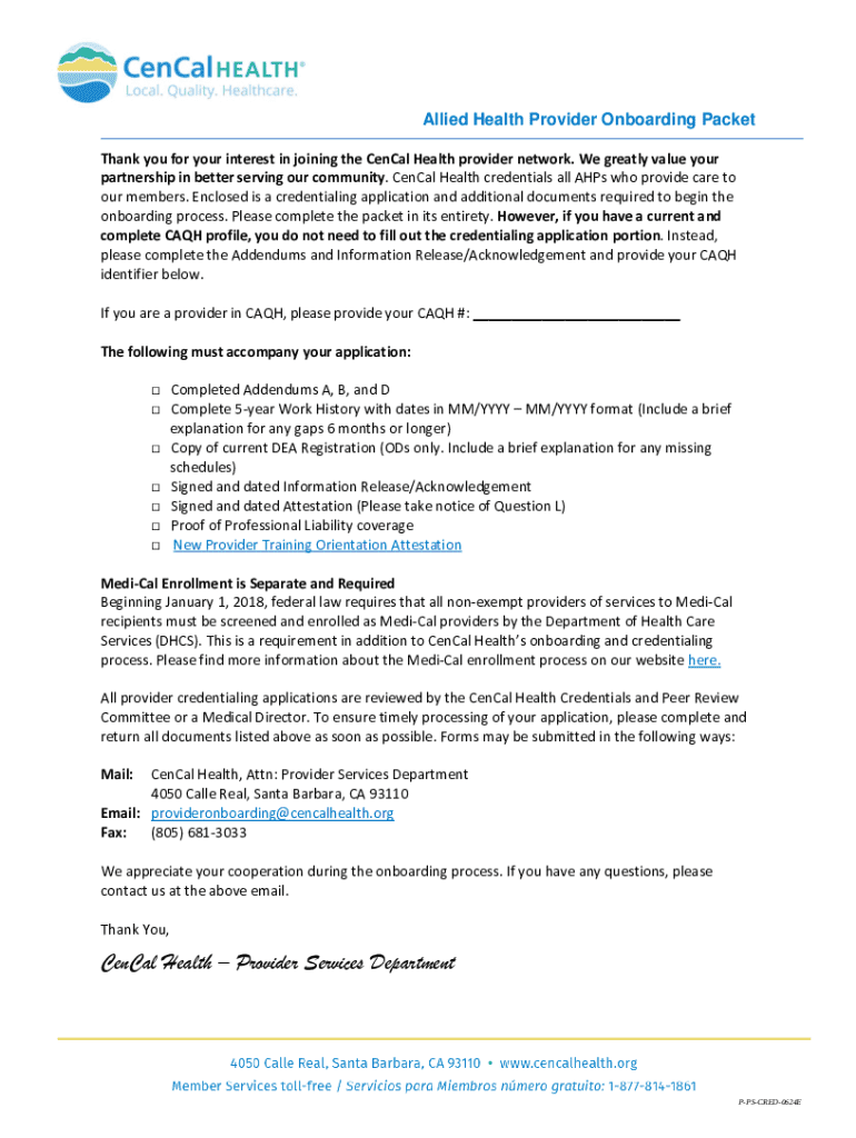 This packet provides essential information and instructions for individuals interested in joining the CenCal Health provider network, outlining credentialing requirements and necessary documents for
