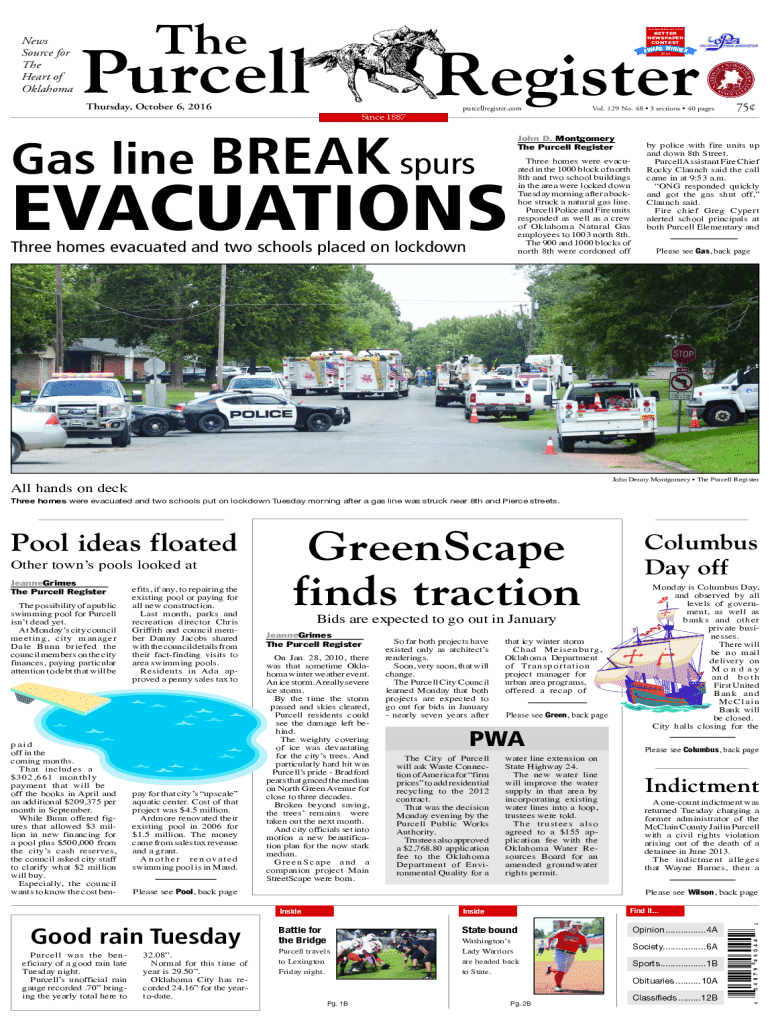News Source for The Heart of OklahomaTheOKLAHOMA PRESS ASSOCIATIONBETTER NEWSPAPER CONTESTWINNER AWA R D2015PurcellRegisterThursday, October 6, 2016Since 1887purcellregister.comGas line BREAK spursVol.