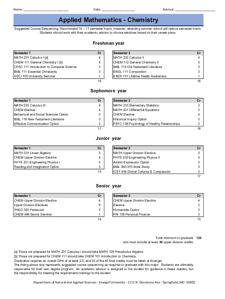Name: ___Date: ___Advisor: ___Applied Mathematics Chemistry Suggested Course Sequencing: Recommend 15 17 semester hours; however, attending summer school will reduce semester hours. Students should
