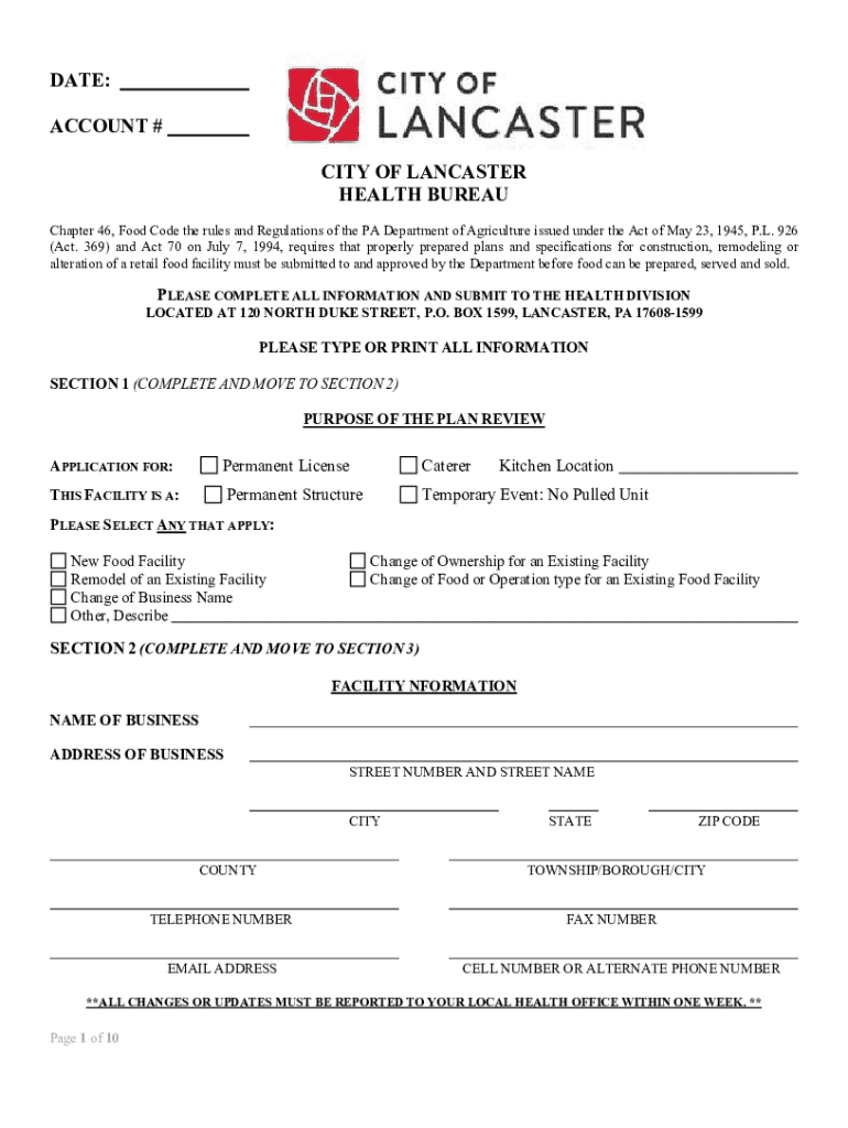 DATE: ACCOUNT # CITY OF LANCASTER HEALTH BUREAU Chapter 46, Food Code the rules and Regulations of the PA Department of Agriculture issued under the Act of May 23, 1945, P.L. 926 (Act. 369) and Act