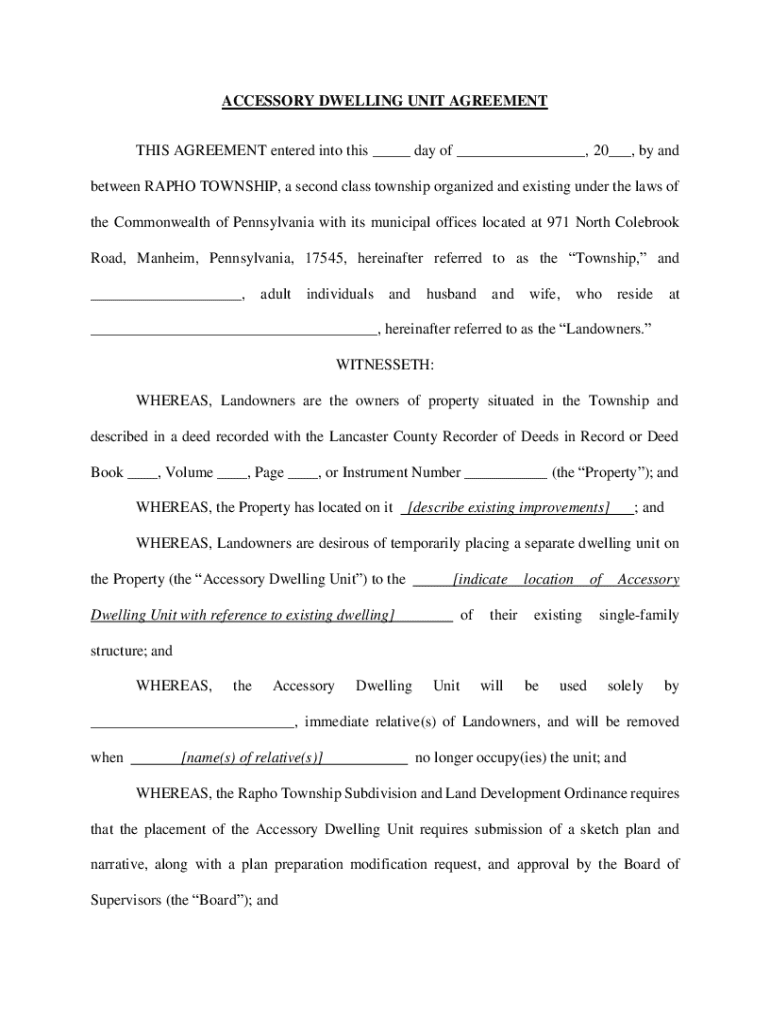 This agreement outlines the terms and conditions under which a Landowner may place an Accessory Dwelling Unit on their property in Rapho Township, including compliance with local ordinances and regulations,