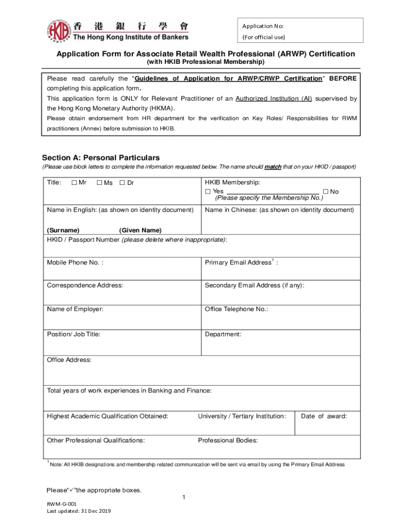 This application form is intended for individuals seeking certification as Associate Retail Wealth Professionals (ARWP) with the Hong Kong Institute of Bankers (HKIB). Applicants must fulfill certain