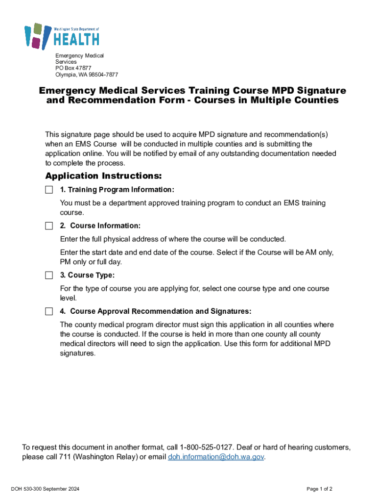 This form is used to acquire MPD signatures and recommendations for EMS training courses conducted in multiple counties, facilitating the application process when submitting online.