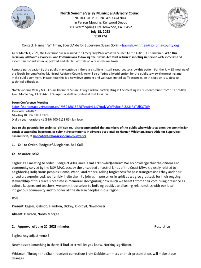 This document provides details about the North Sonoma Valley Municipal Advisory Council\'s meeting on July 18, 2023, including the agenda, in-person and remote participation options, and item discussions