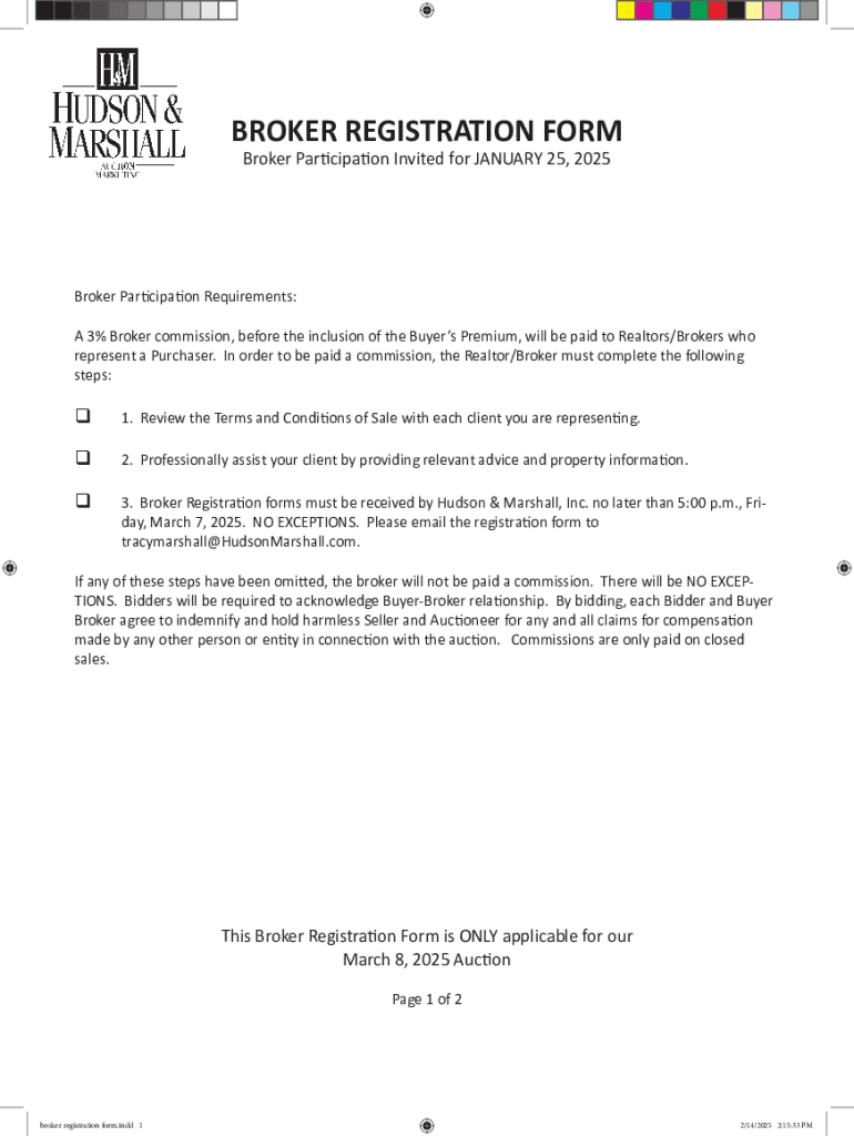 This form is intended for brokers who wish to participate in the auction on March 8, 2025. It outlines the requirements for broker registration, commission details, and the required acknowledgments