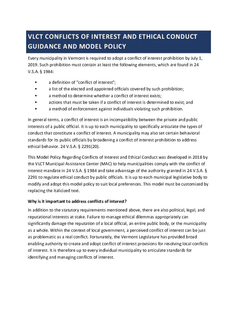 Get the free Vlct Conflicts of Interest and Ethical Conduct Guidance and Model Policy