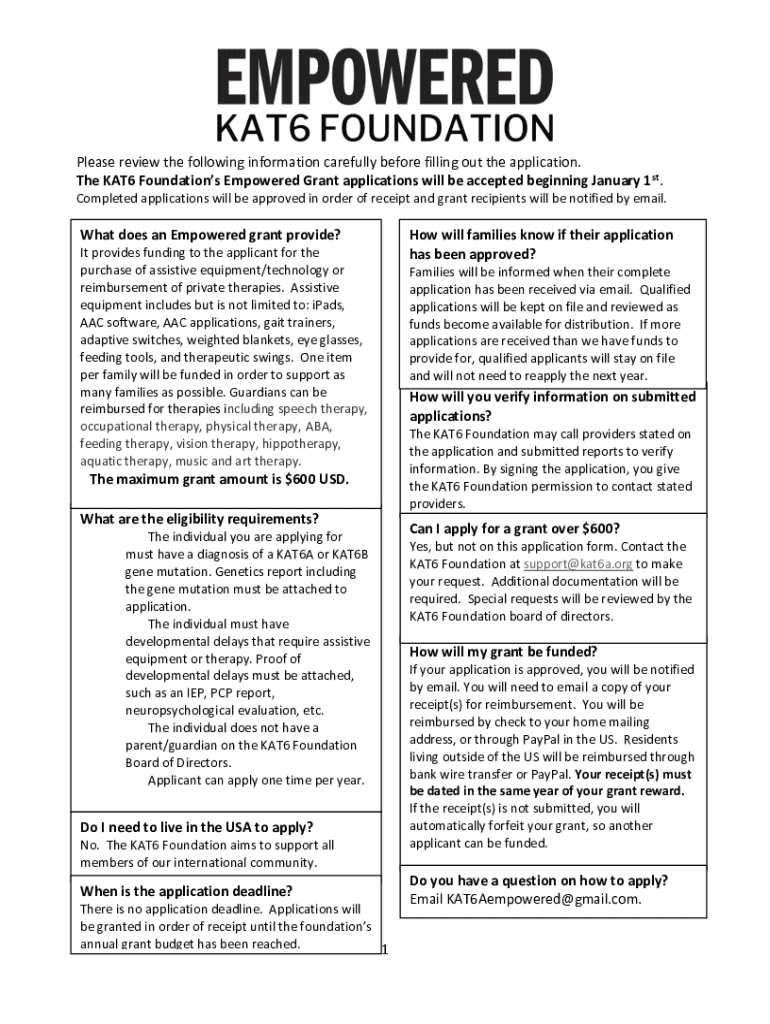 This application allows individuals with a KAT6A or KAT6B gene mutation to apply for funding to purchase assistive equipment or to be reimbursed for therapies. The program aims to support as many